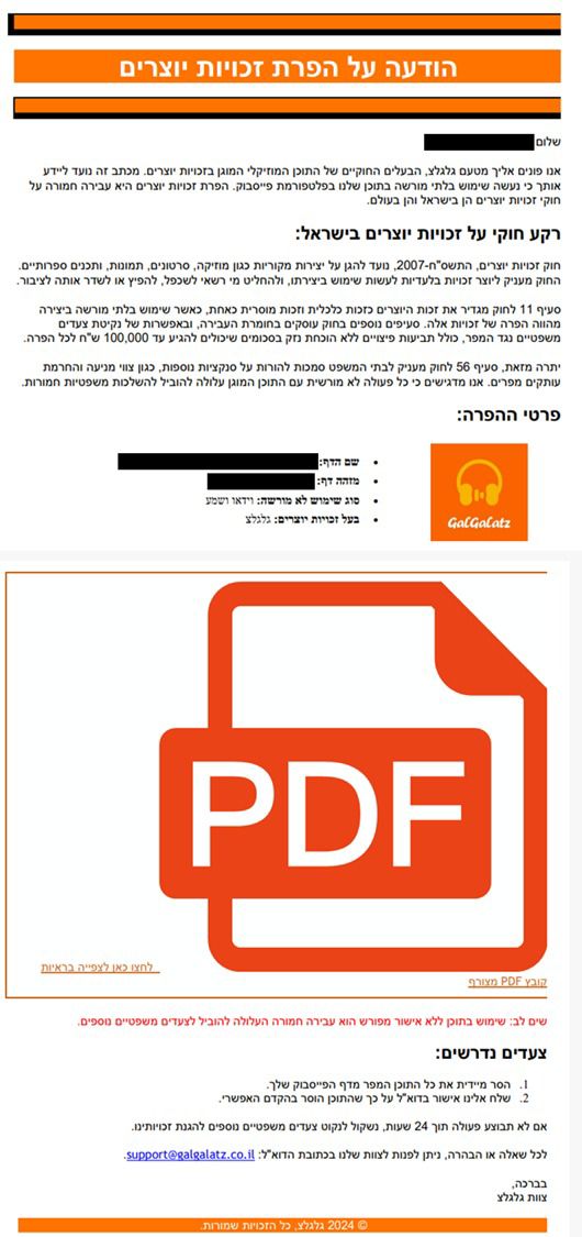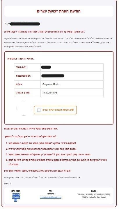 בהודעה שפורסמה היום (חמישי), נכתב: "נרצה להביא לידיעת הציבור כי קיבלנו פניות ממספר אזרחים ובעלי עסקים אודות הודעות על הפרת זכויות יוצרים שנשלחו לכאורה מטעם גלגלצ, בצירוף דרישה להסרת תכנים מיידית, איום בתביעה, ולעיתים גם בצירוף קישוריות חשודות.