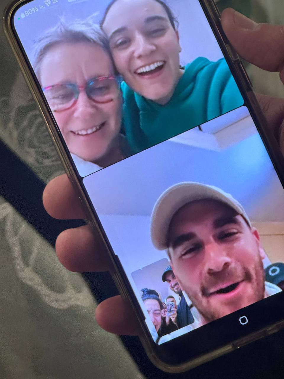 בתמונה ניתן לראות את אמילי מחובקת עם אמא מנדי, בשיחה ראשונה עם משפחתה לאחר השחרור מהשבי.