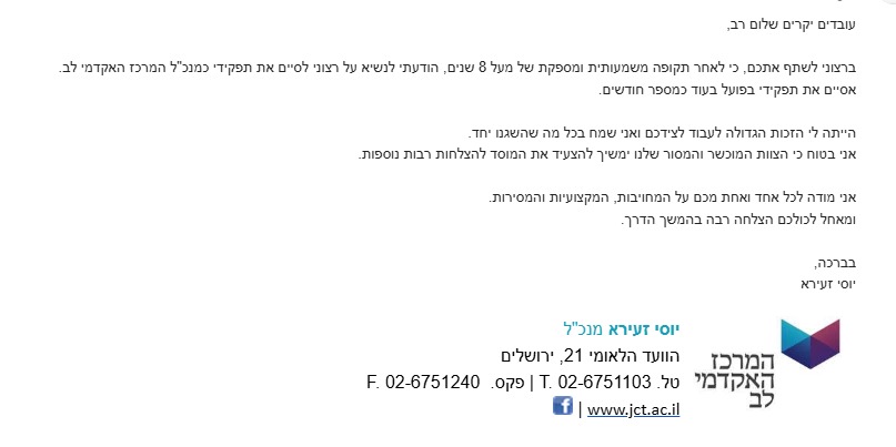 "הייתה לי הזכות הגדולה לעבוד לצידכם ואני שמח בכל מה שהשגנו יחד. אני בטוח כי הצוות המוכשר והמסור שלנו ימשיך להצעיד את המוסד להצלחות רבות נוספות".