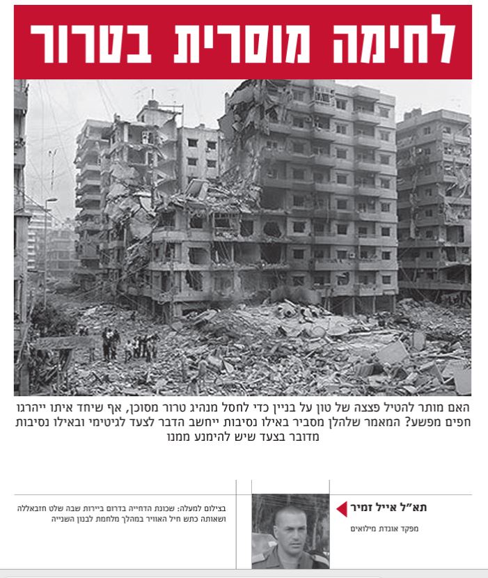 את דבריו פותח זמיר בשאלה: "האם מותר להטיל פצצה של טון על בניין כדי לחסל מנהיג טרור מסוכן, אף שיחד איתו ייהרגו חפים מפשע?" בתוכן המאמר מסביר זמיר לדבריו "באילו נסיבות ייחשב הדבר לצעד לגיטימי ובאילו נסיבות מדובר בצעד שיש להימנע ממנו".