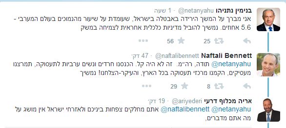 מי שהגיב לו בציוץ הוא שר הכלכלה נפתלי בנט, שלקח לו את הקרדיט: "תודה, רה״מ. זה לא היה קל. הכנסנו חרדים ונשים ערביות לתעסוקה, תמרצנו מעסיקים, הקמנו מרכזי תעסוקה בכל הארץ, והעיקר-הצלחנו! נמשיך".
