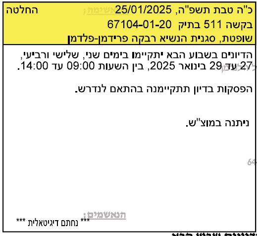 השופטים, דחו את בקשתו וקבעו כי הדיונים יתקיימו כרגיל – 3 פעמים בשבוע, אולם באורך מקוצר יותר וכמו כן אישרו לו הפסקות לפי הצורך תוך כדי העדות.