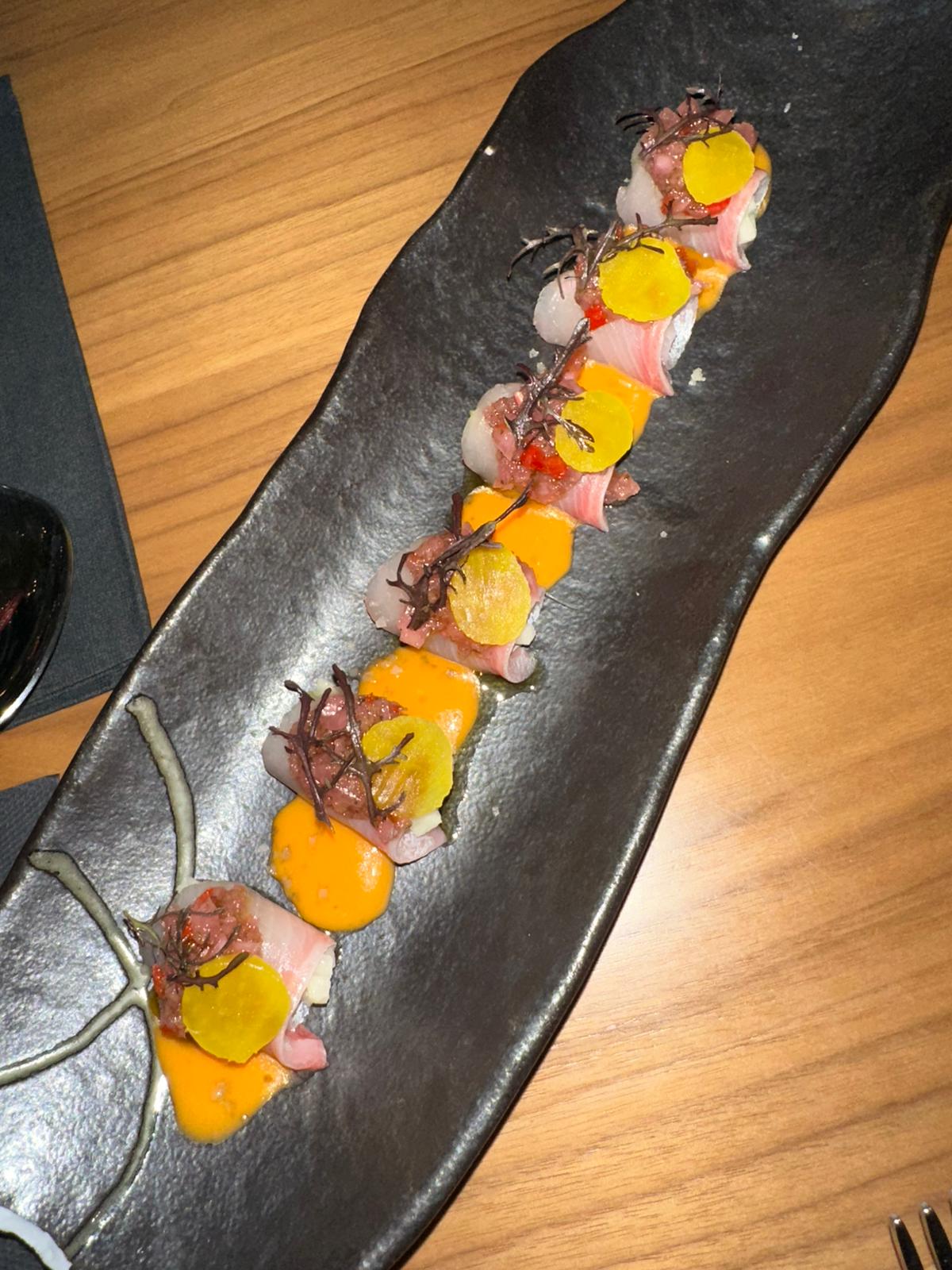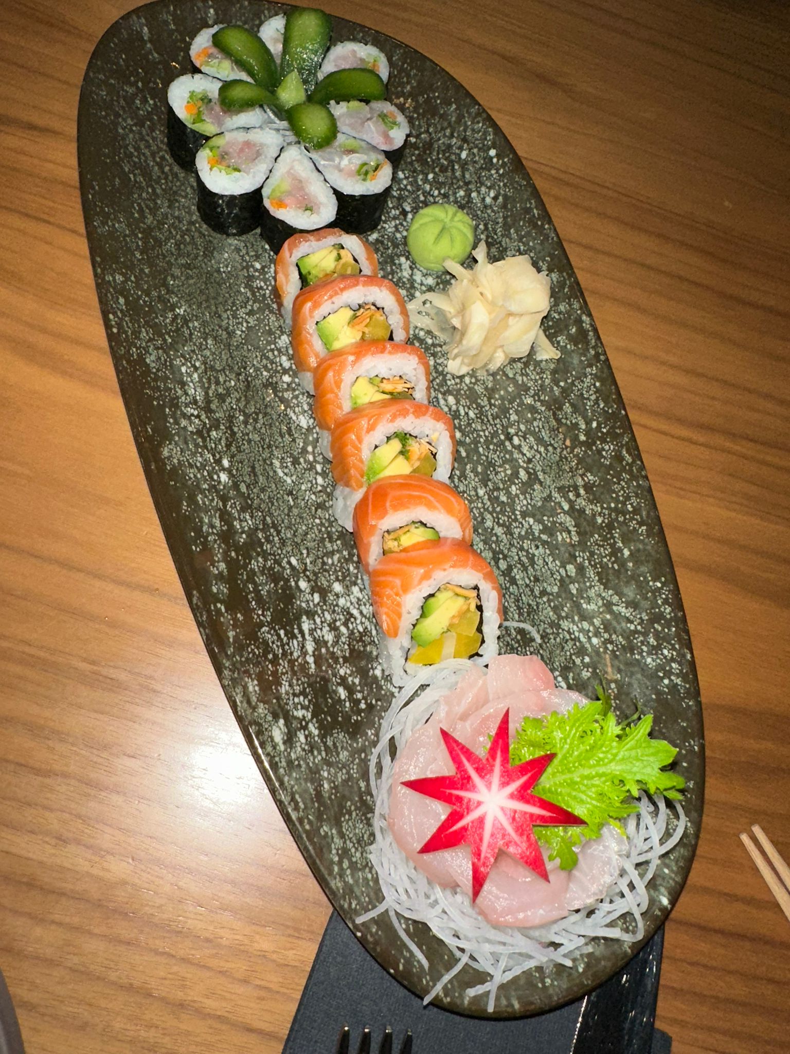 וכמובן איך לא, הגענו למנות הסושי. שגם הוא כמו יתר המנות היה טרי וטעים. עם מעטפת של דג סלמון עסיסי, ומילוי שקדים טעים במיוחד. (המחירים של הסושי משתנים בהתאם למנות).