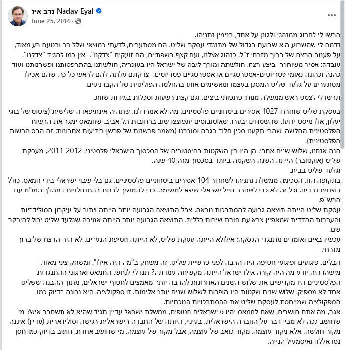 "אני חושב בדיעבד, בדגש על בדיעבד, שעסקת שליט – עניין שהובל בידי הליכוד, הימין ובנימין נתניהו – היה שגיאה במובן של מחיריה הקשים ב7 באוקטובר. בהחלט כתבתי בעדה, כולל בפוסט הזה, שבו גוננתי על נתניהו וזו התבררה כשגיאה.