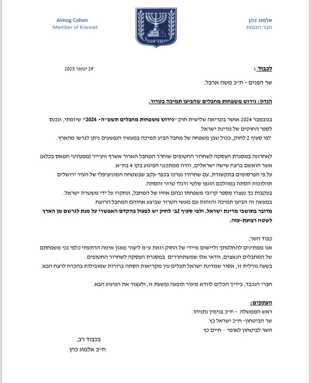 ח"כ אלמוג כהן פנה לשר הפנים משה ארבל וביקש ממנו ליישם את החוק שלו לגירוש משפחות מחבלים ולגרש את אחיו של אחד המחבלים ששוחרר בעסקת החטופים והשתתף בתהלוכת הסתה וטרור עם שחרורו