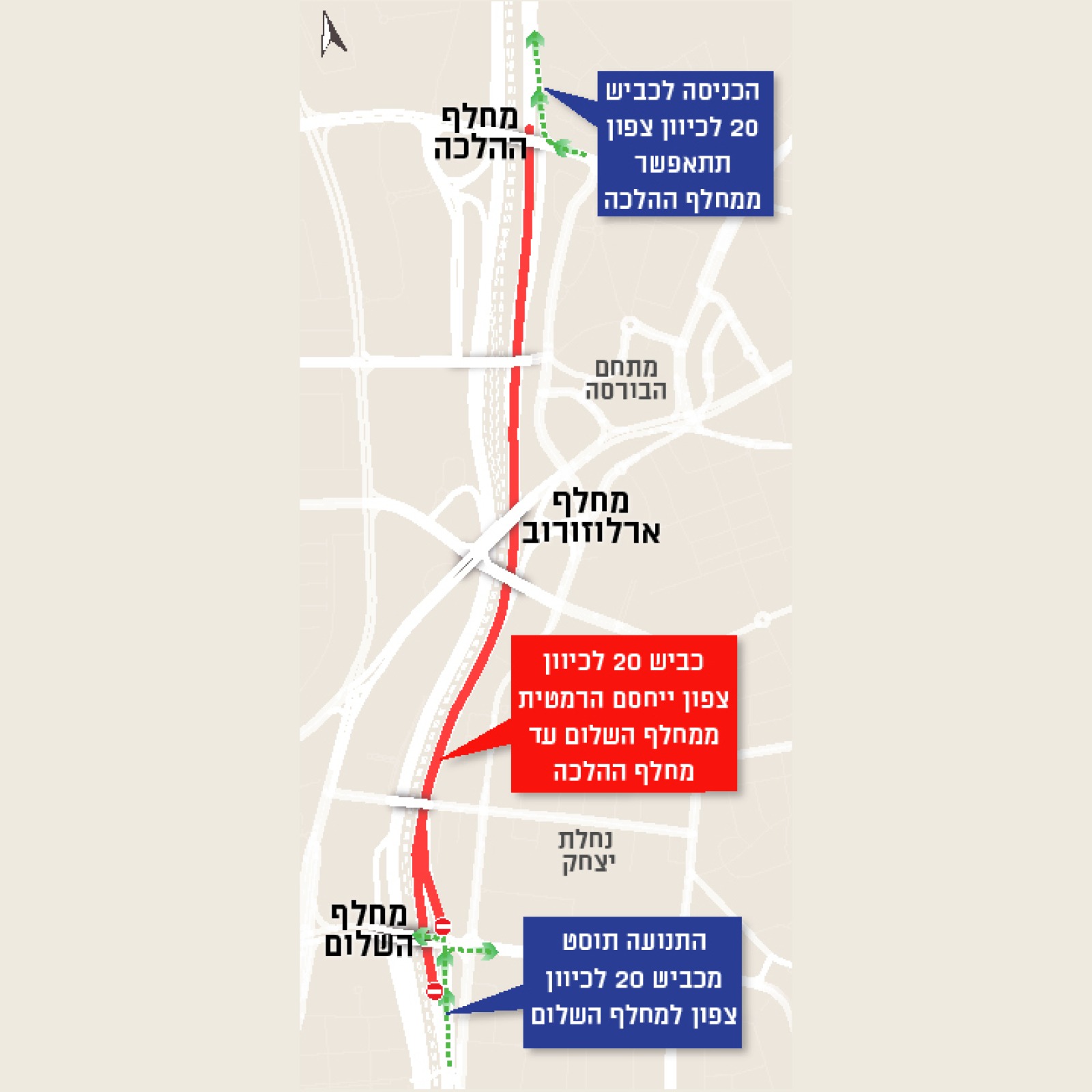 כביש איילון צפון ייחסם לתנועה לנוסעים בכיוון צפון, בקטע שבין מחלף השלום למחלף ההלכה, לא תתאפשר הכניסה לכביש איילון צפון (כביש 20) ממחלף השלום. הכניסה לכביש איילון צפון ממחלף ההלכה תתאפשר כרגיל.