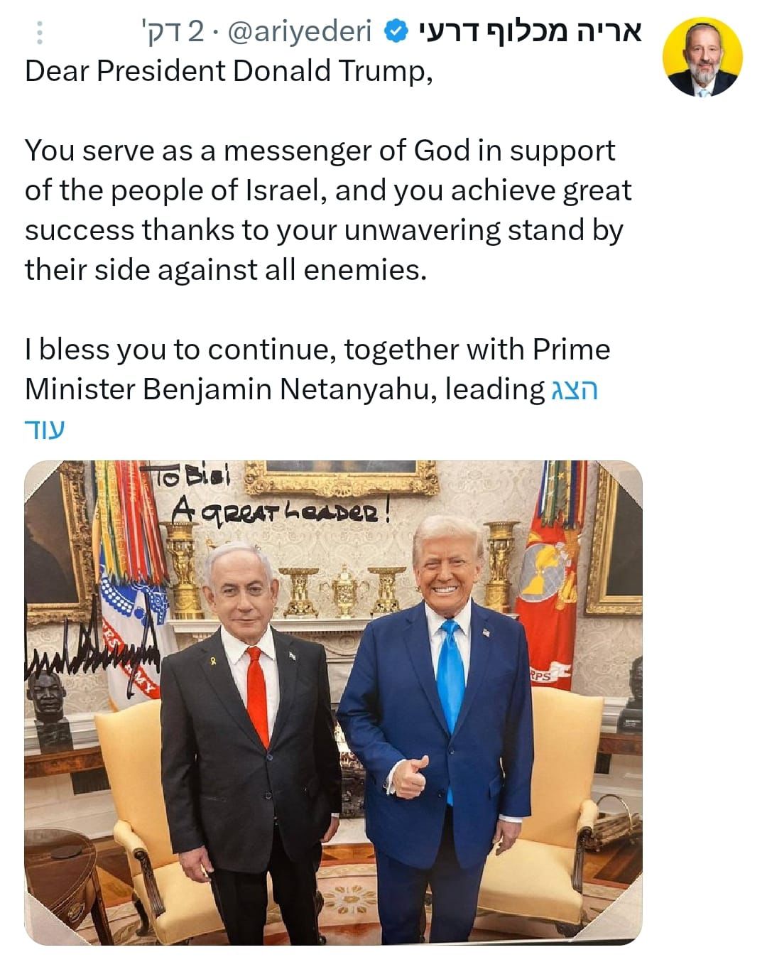 "הנשיא דונלד טראמפ היקר" כתב דרעי באנגלית ובעברית, "אתה פועל כשליח האל למען העם היהודי, וזוכה להצלחה רבה בזכות עמידתך האיתנה לימין עם ישראל מול כל אויביו. אני מברך אותך שתמשיך, יחד עם ראש הממשלה בנימין נתניהו, להוביל מהלכים היסטוריים שיביאו לשינוי המזרח התיכון ולחיזוק השלום והביטחון של עם ישראל"