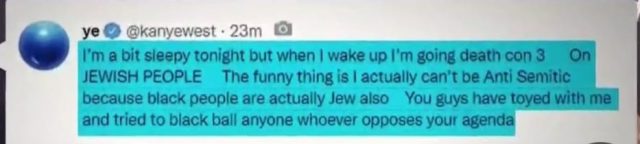 ביום שישי האחרון, העלה הראפר כמה ציוצים כאלה, כשבאחד מהם הוא כתב "אני אוהב את היטלר", ובציוץ נוסף הוא הכריז: "אני נאצי". עוד התייחס לניתוק קשרי עבודה עימו בעבר אחרי התבטאויות דומות וצייץ: "אני אוהב שיהודים באים אליי ואומרים לי שהם לא יכולים לעבוד איתי יותר".