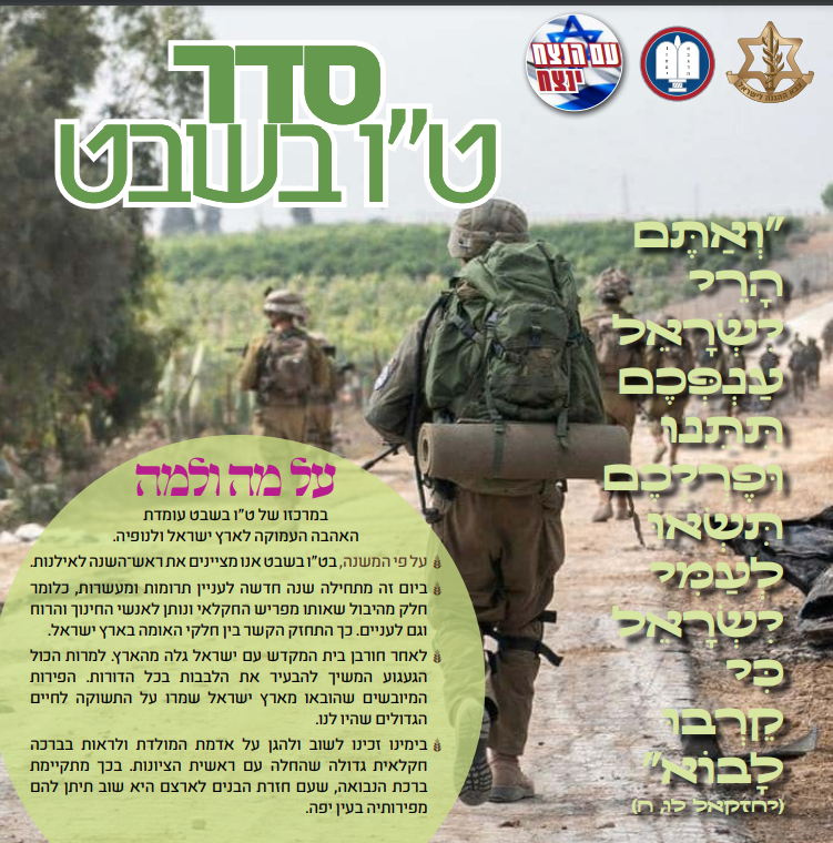 הרבנות הצבאית הוציאה סדר ט"ו בשבט עם מנהגי החג, הברכות וההסברים בכל שלב. אז ערכו שולחן עם פירות, שבו עם המשפחה, והדליקו שירים לאווירה ויש לכם אחלה אווירת ט"ו בשבט. חג אילנות שמח!