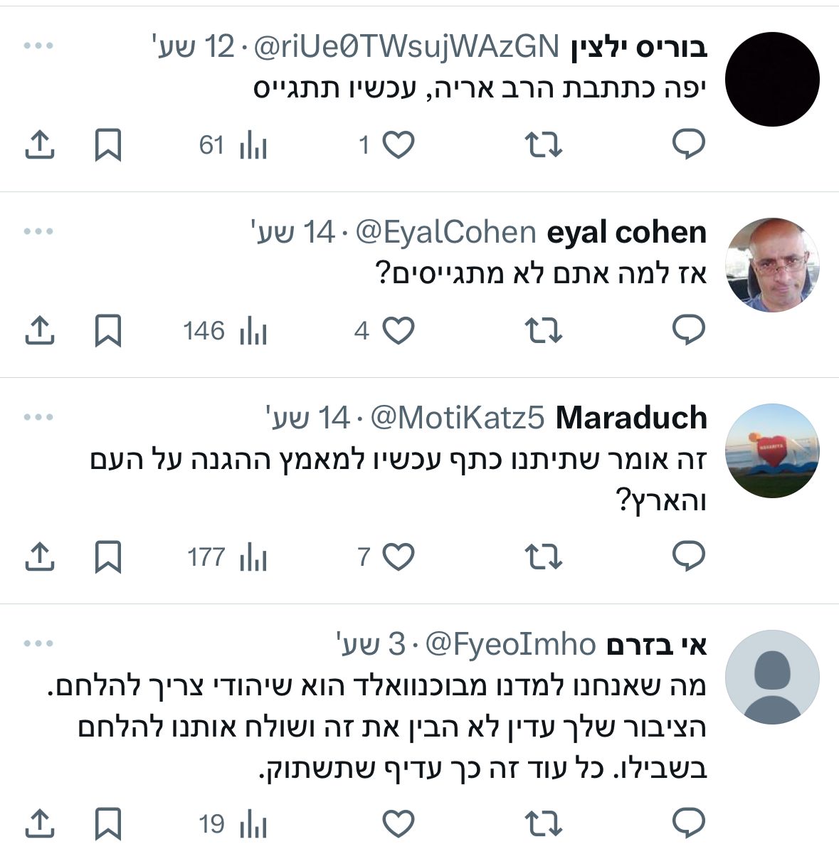 יאיר וייגלר, יו"ר פורום מילואימניקים דתיים הגיב לו: "תסלח לי רב אריה. אבל מי שמסוגל לראות את זה ועדיין לא לעזוב את ביתו, לא קפץ להציל את אחיו, חושש על עולמו הדתי. כבר יותר משנה שצריך לשאול איפה הלב שלו, אם זו תורתו לי אין חלק ונחלה בתורה זו ואני חושש שגם שכינה לא שורה בבית מדרש שכזה".