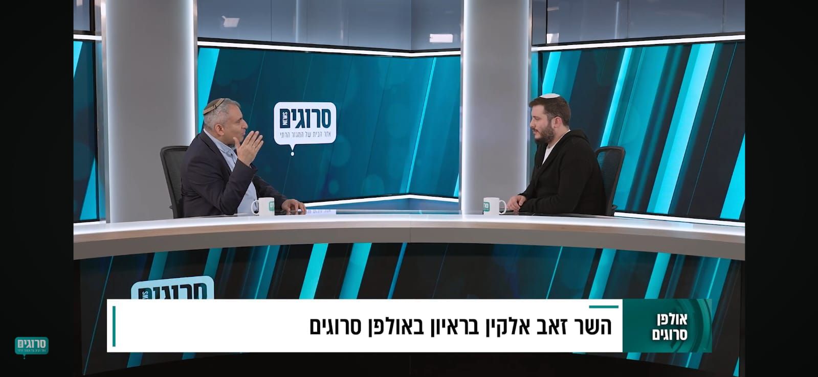 חבר הקבינט המדיני ביטחוני, השר במשרד האוצר זאב אלקין שאחראי על שיקום הדרום והצפון הגיע לאולפן סרוגים לראיון נרחב במיוחד בו התייחס להקמת ועדת חקירה ממלכתית ולמחלוקת שלו עם חבריו לממשלה. בנוסף התייחס השר אלקין לתמיכתו בעסקת החטופים ועל הדרך שלפי דעתו ישראל צריכה ללכת ביחס לעזה ולארגון הטרור חמאס.