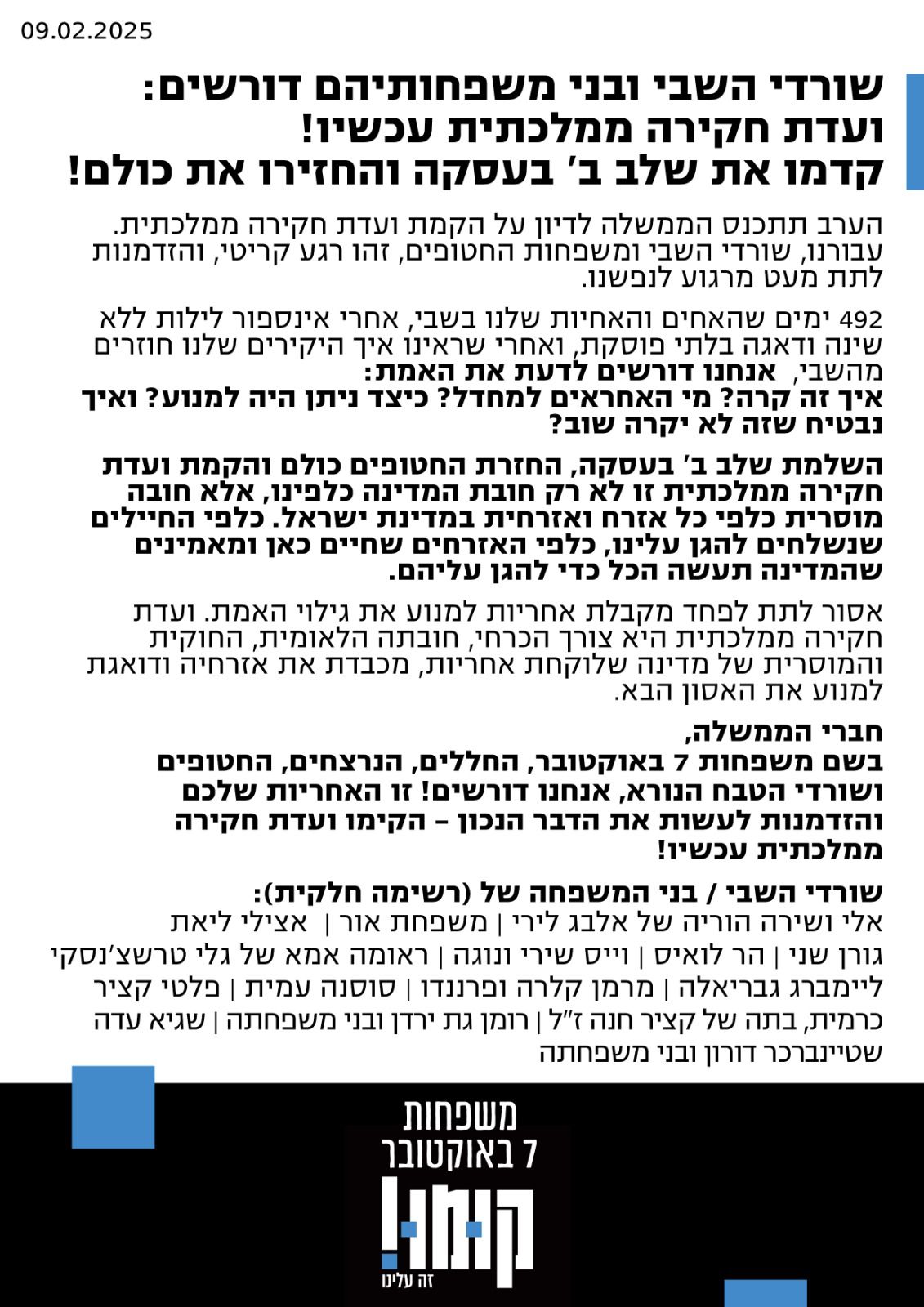 "אסור לתת לפחד מקבלת אחריות למנוע את גילוי האמת. ועדת חקירה ממלכתית היא צורך הכרחי, חובתה הלאומית, החוקית והמוסרית של מדינה שלוקחת אחריות, מכבדת את אזרחיה ודואגת למנוע את האסון הבא. חברי הממשלה, בשם משפחות 7 באוקטובר, החללים, הנרצחים, החטופים ושורדי הטבח הנורא, אנחנו דורשים! זו האחריות שלכם והזדמנות לעשות את הדבר הנכון – הקימו ועדת חקירה ממלכתית עכשיו!".