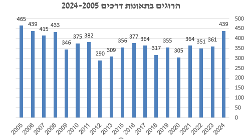 439 בני אדם נהרגו בתאונות דרכים בשנת 2024 כך עולה מנתוני הלמ"ס. מהנתונים עולה כי בהשוואה לשנת 2023 מדובר בעליה חדה של 22% כאשר 361 בני אדם נהרגו בתאונות דרכים בשנת 2023.