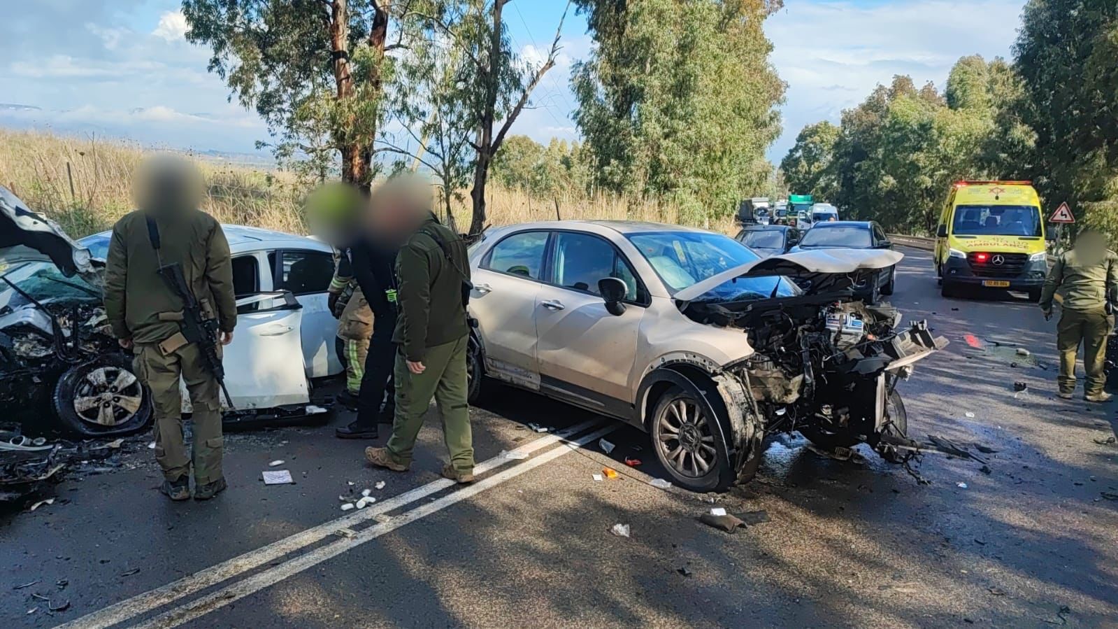 פראמדיק במד"א קלוד עיסא וחובש בכיר במד"א אסף יהודה סיפרו כי "קיבלנו דיווח על תאונת דרכים חזיתית בין מספר כלי רכב. הגענו למקום במהירות, וראינו את הרכבים עם פגיעות פח משמעותיות וקשות, ו-3 פצועים במקום. נהג אחד הרכבים, גבר כבן 30, היה לכוד, מעורפל הכרה וסבל מחבלות קשות בראש ובגפיים. תוך כדי פעולות החילוץ של הכבאים, הענקנו לו טיפול רפואי ראשוני ומציל חיים שכלל חבישות ועצירת דימומים, ופינינו אותו במסוק מד"א-הצלה אייר לבית החולים כשמצבו קשה. בנוסף, מהמקום פינינו בניידות טיפול נמרץ של מד"א 2 פצועים נוספים, בהם צעירה כבת 18 במצב בינוני שסובלת מחבלות בגפיים ובחזה, ופצוע נוסף במצב קל".