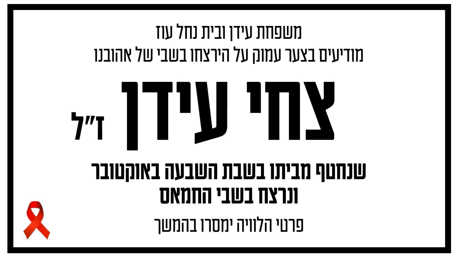 משפחת עידן הודיעה הבוקר (חמישי) כי זוהתה גופתו של צחי עידן ז"ל שנחטף בשבעה באוקטובר מביתו בנחל עוז. משפחתו ציינה כי הוא נחטף כשהיה בחיים וכי היא קיבלה ממנו מספר אותות חיים במהלך התקופה בה היה החטוף.