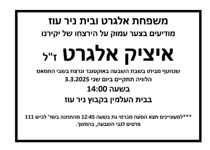משפחת אלגרט פרסמה את מועד ההלוויה של החטוף החלל איציק אלגרט ז"ל שנרצח בשבי החמאס וגופתו הוחזרה הלילה (בין רביעי לחמישי) לידי ישראל.