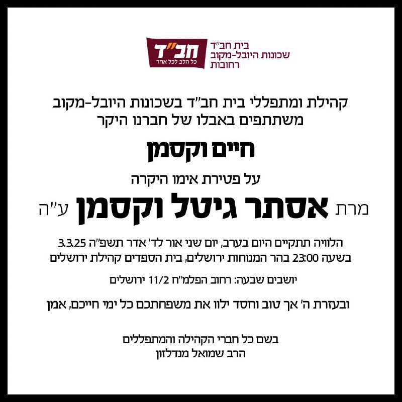 ברוך דיין האמת: בגיל 76 הלכה היום (שני) לעולמה אסתר וקסמן, אמו של נחשון וקסמן. הלוויתה תתקיים הערב בשעה 23:00 בהר המנוחות בירושלים. יהודה, אביו של נחשון הלך לעולמו ביוני 2020 בעקבות מחלה קשה.