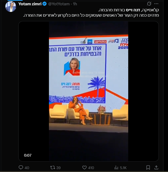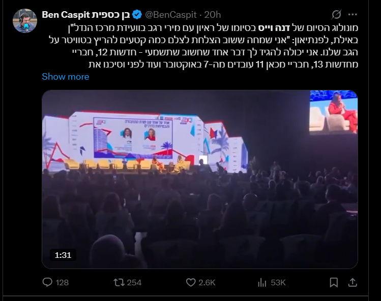 ברשת תוקפים את הפרשנית המדינית של חדשות 12 – דנה ויס, לאחר שנמלטה מהבמה במהלך ראיון שקיימה עם שרת התחבורה מירי רגב בוועידת מרכז הנדל"ן באילת.