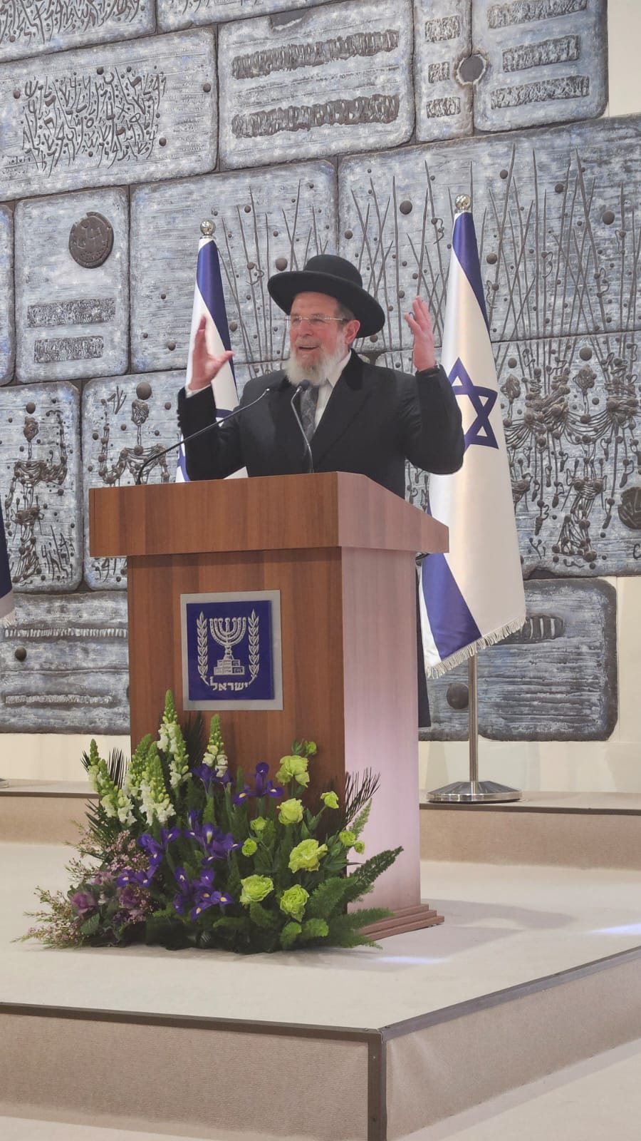 "כבוד הנשיא" המשיך הרב – "סבך הרב יצחק הרצוג טבע את המטבע "ראשית צמיחת גאולתנו" תהליך הגאולה הוא "כצמח דוד עבדך" בשלבים. חז"ל אומרים שהגאולה היא כמו תפילת שמונה עשרה כסדר הברכות "ברך עלינו" – אנו רואים את הנגב הגליל פורח כפי שמעולם לא פרח, "תקע בשופר גדול" בתפוצות באתיופיה ברוסיה בכל מקום נפתחו השערים שנזכה לראות בברכת השלום ותחזינה עינינו בשובך לציון ברחמים. שנזכה לראות את כל חטופינו שבים ארצה בראים בגופם ובנפשם"