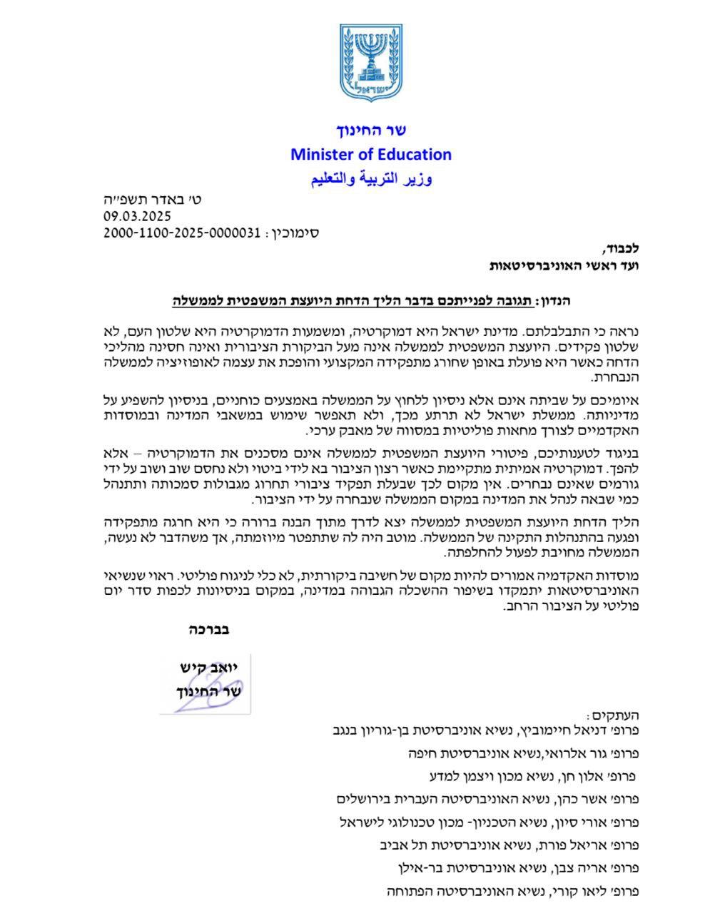 שר החינוך יואב קיש הגיב לאיומי ראשי האוניברסיטאות בנוגע להשבתת הלימודים, בעקבות הליך הדחת היועצת המשפטית למשרד החינוך. בהצהרה שפרסם כתב קיש: