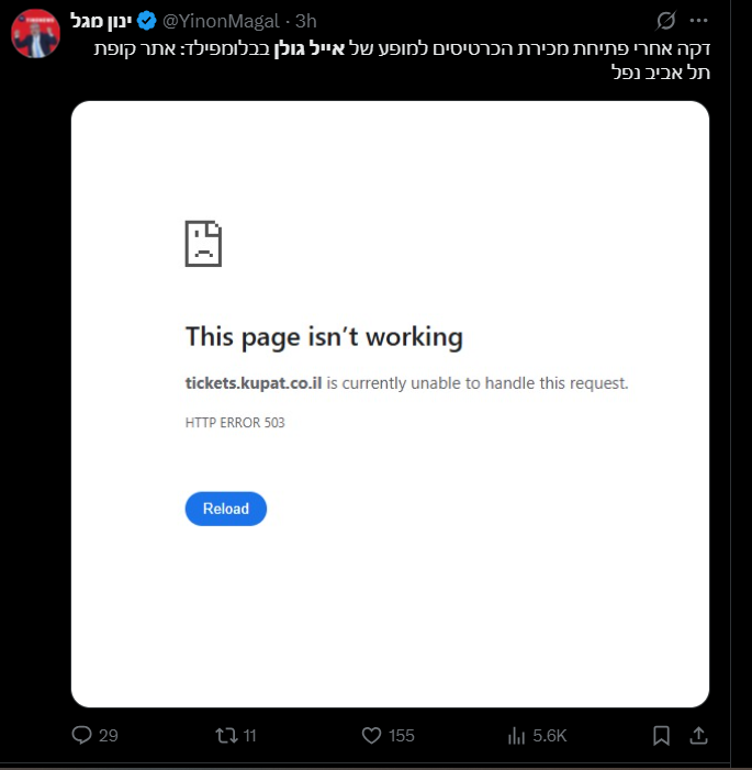 גם איש התקשורת ינון מגל שיתף לעשרות אלפי עוקביו כי אתר קופות תל אביב קרס בעקבות פתיחת המכירה.