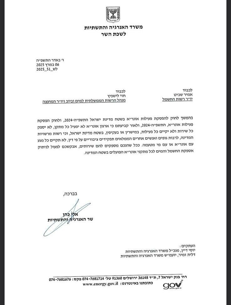 שר האנרגיה אלי כהן השיב להאשמות ותקף בחזרה: "אונר״א שימש כזרוע ביצועית של החמאס, ובהתאם נתתי הנחיה נחרצת לניתוק כל מגע עם אונר״א.יחד עם זאת, מקווה שחברת הכנסת מלינובסקי תסיק את המסקנות אחרי שמפלגתה הייתה שותפה בממשלה שנשענה על תומכי חמאס. ומן הראוי שתתן קרדיט לחברי הכנסת מהליכוד שהיו שותפים להצעת החוק: בועז ביסמוט, אלי דלל, חנוך מיליבצקי, טלי גוטליב וניסים ואטורי".