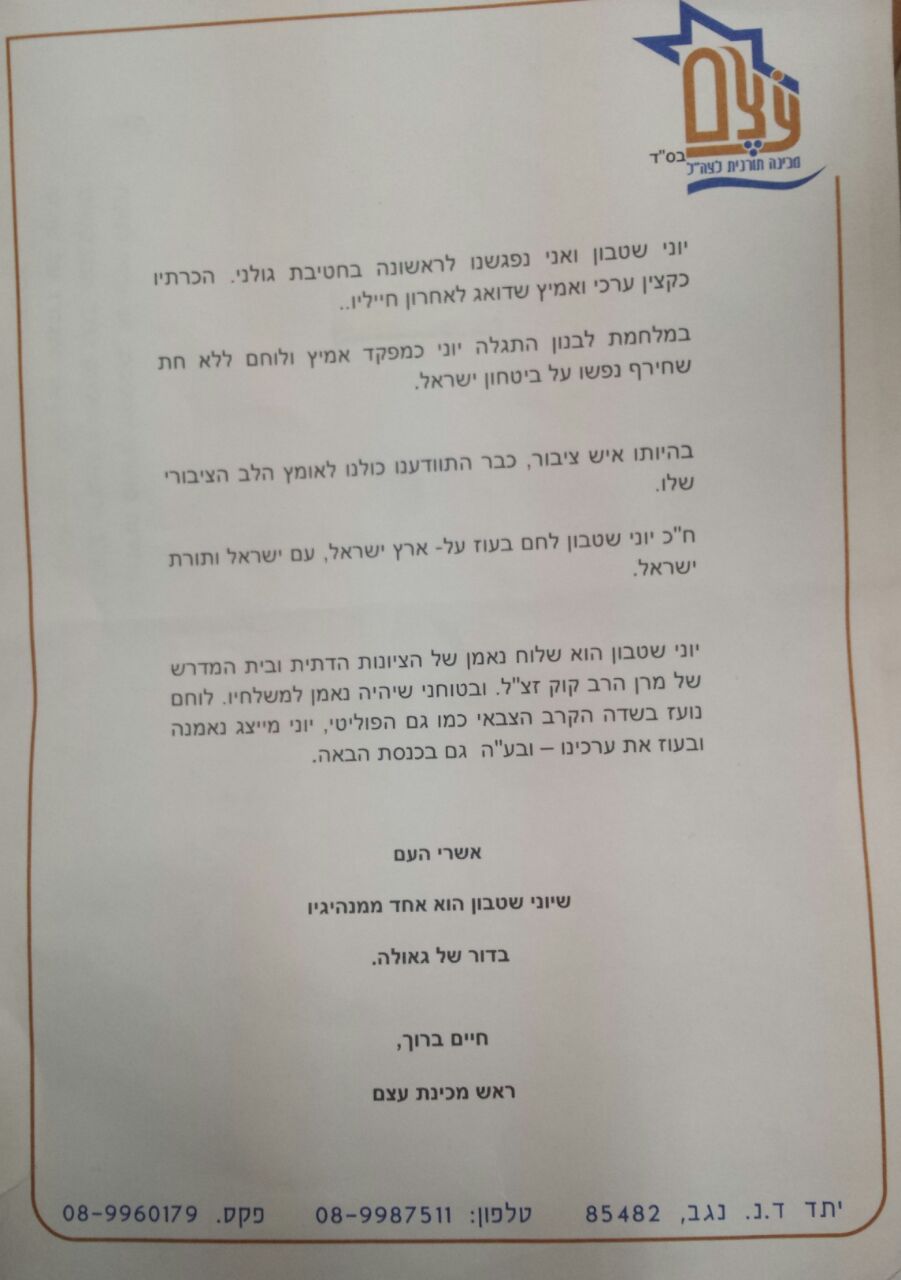 "בהיותו איש ציבור התוודענו כולנו לאומץ הלב הציבורי שלו", כתב הרב ברוך במכתב שפרסם היום (ב'). "ח"כ יוני שטבון לחם בעז על ארץ ישראל, עם ישראל ותורת ישראל".