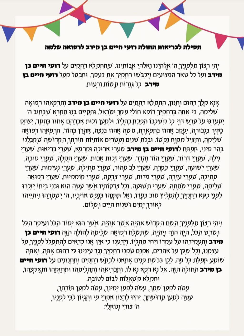"רועי חיים זקוק לכם", מבקשים במשפחה. "נשמח שתקדישו את הזמן לרפואתו של רועי חיים בן מירב. נשמח שתצטרפו אלינו בתפילות, אמירת תהילים, כוונה בברכת "אשר יצר", צדקה לרפואתו ועוד. אנחנו רוצים להרעיד את השמיים ושכל מי שיכול לדאוג לתפילה/לימוד והתכנסות לרפואתו ירתם. אנחנו רוצים להגיע לכמה שיותר ישיבות, אולפנות, כוללים, מדרשות ותלמודי תורה שיתפללו לרפואתו".