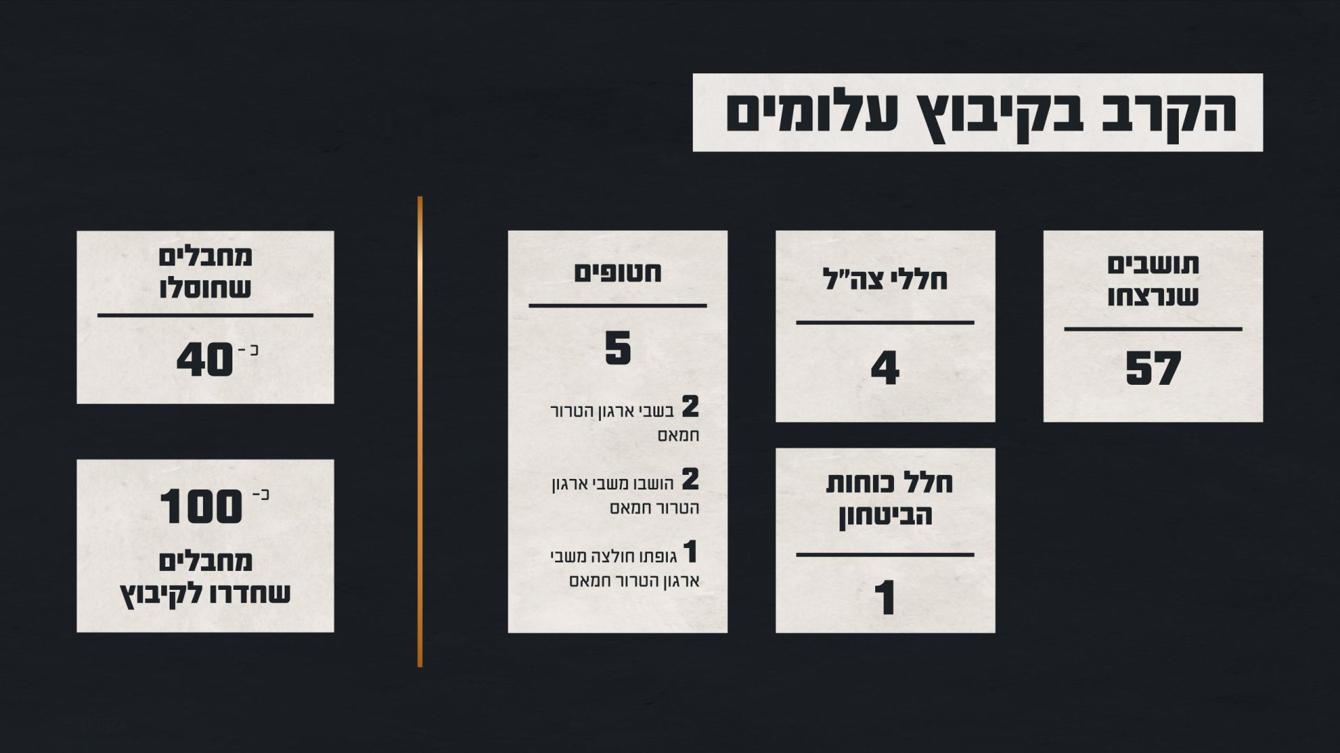 בקרבות במרחב עלומים ובקיבוץ נרצחו 57 אזרחים ונפלו 5 אנשי כוחות הביטחון. ממרחב עלומים נחטפו חמישה, מתוכם שלושה נחטפו בחיים ושניים חללים. שניים מהחטופים עדיין מוחזקים ב עזה. מהתחקיר עולה כי למרחב עלומים חדרו כ100- מחבלים. רובם מחבלי נוח'בה אשר ביצעו מסע טבח, חטיפה, ביזה ופשעים אכזריים נוספים.