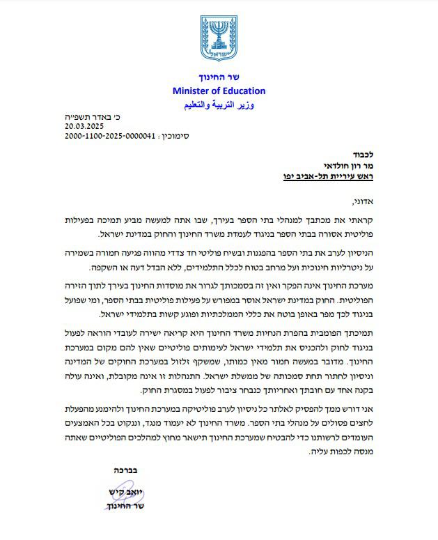 שר החינוך יואב קיש כתב היום (חמישי) מכתב לראש עיריית תל אביב רון חולדאי ובו הפציר בו להפסיק את התמיכה בפעילות פוליטית אסורה בבתי הספר.