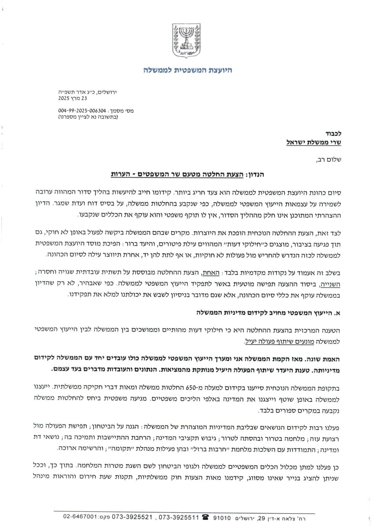 בסוף המכתב היא כותבת לשרים את עיקר הטענות להדחתה: "לא אמון מבקשת ההצעה לקדם אלא נאמנות לדרג הפוליטי. לא משילות, אלא כוח שלטוני ללא גבולות, כחלק ממהלך רחב יותר להחלשת הרשות השופטת והרתעת הדרגים המקצועיים כולם. הממשלה מבקשת להיות מעל החוק, ולפעול ללא בקרה ואיזונים, גם בתקופות רגישות ביותר – שעת חירום, מחאות נגד השלטון ותקופת בחירות".