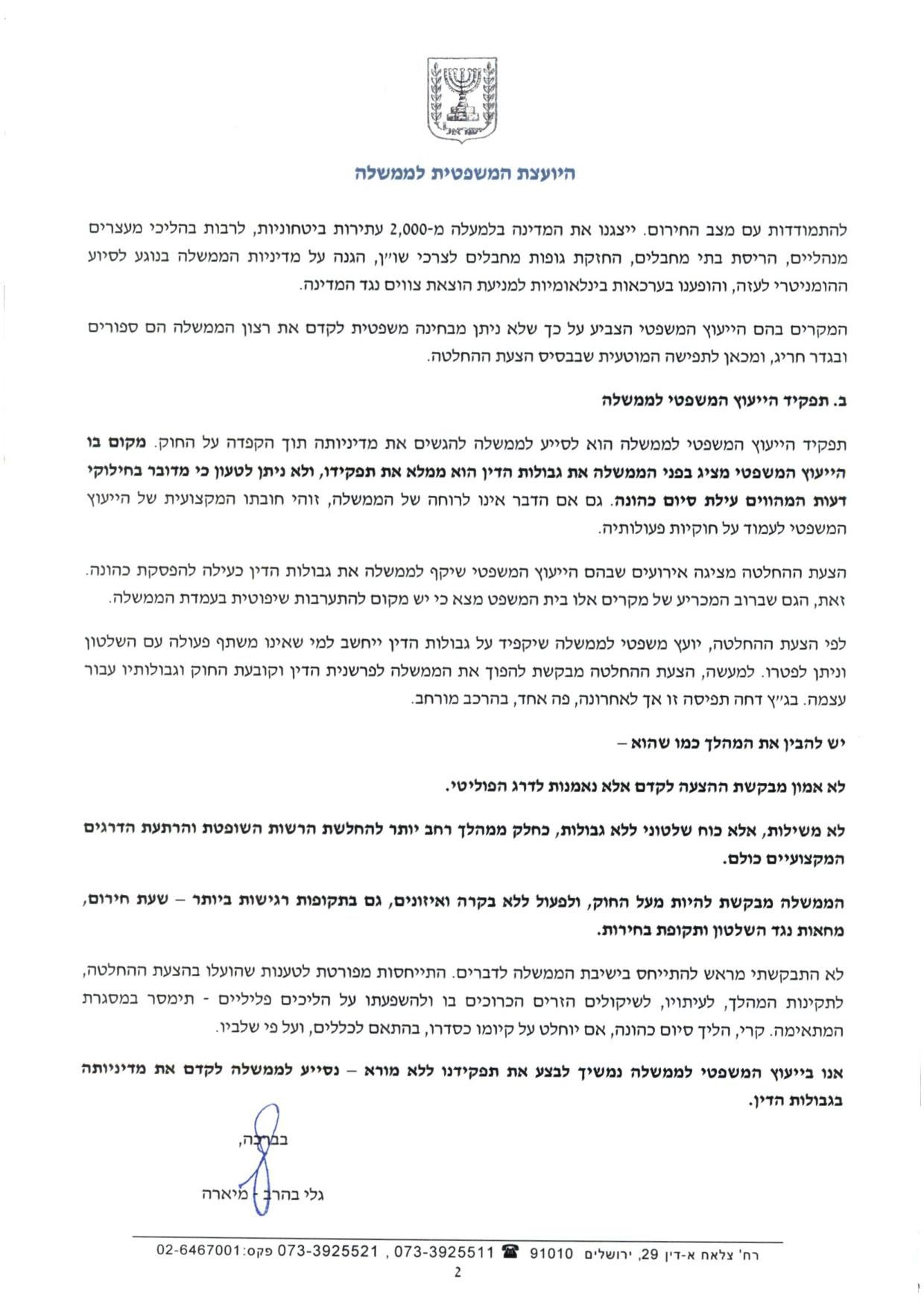 עוד נכתב במסמך: ״היועצת המשפטית הנוכחית לממשלה עו"ד גלי בהרב- מיארה, יצרה בישראל "דמוקרטיית גיזלות". בעוד שרוממות ערכי הדמוקרטיה בגרונה, לאמיתו של דבר ריסקה עד עפר את אותם עקרונות בשמם התיימרה לפעול. את השרץ שחפצה ביִקָרֹו – טיהרה, ואת הכָשֵר שלא לרּוחה – טימאה. וכל זאת בכסות צינית ודֹוגמטית של "שלטון החוק", ממש ככנסייה בימי הביניים שפעלה כביכול "בשם האל". .