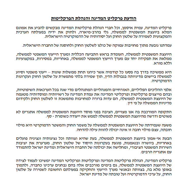 נזכיר כי מוקדם יותר היום (ראשון) שלח איסמן מכתב לכלל הפרקליטים במדינה ובו חיזק את ידיה של היועצת המשפטית לממשלה גלי בהרב-מיארה, זאת ברקע הליך הדחתה שהחל היום. איסמן כתב: "הבעת אי-אמון ביועצת המשפטית לממשלה, בעת שהיא וצוותה וכל נציגותיה ונציגיה פועלים באחריות, ביושרה ובנאמנות, פוגעת בעקרונות היסוד של שלטון החוק, מערערת את יציבות השירות המשפטי הציבורי, ומחלישה את יכולתה של החברה הישראלית ומדינת ישראל להתמודד עם אתגריה הרבים".
