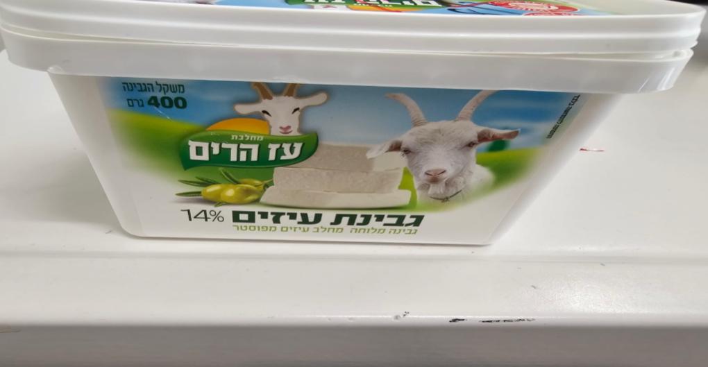 גבינת עיזים 14% – גבינה מלוחה מחלב עיזים מפוסטר, מתוצרת מחלבת ג'דודנא, נושאת סימן מסחרי "מחלבת עז הרים", עם סימון מועד פג תוקף לשימוש עד 25\05\25 כשר לפסח.