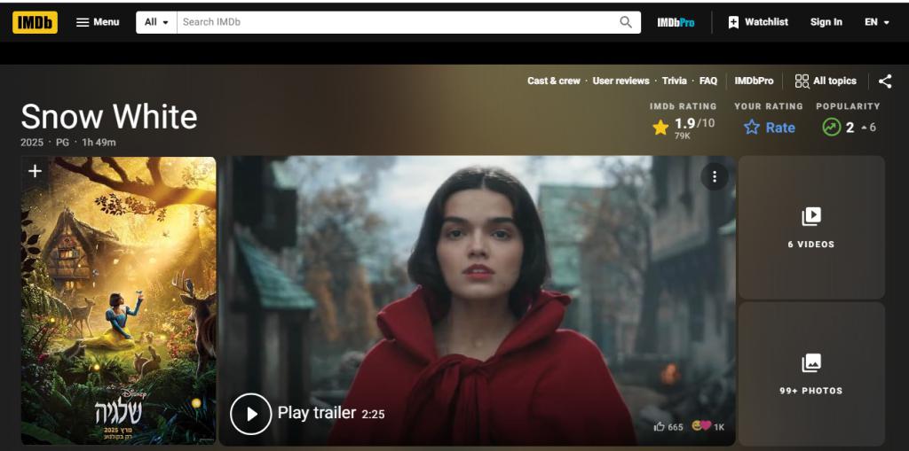 עוד בשורה רעה לדיסני: הסרט שלגיה, שכבר גרר יותר מידי סערות תקשורתיות, ממשיך להתרסק. באתר IMDB, פלטפורמה מקיפה לדירוגים, ביקורות ומידע על סרטים וסדרות, מדורג הסרט שלגיה ב-1.9 כוכבים, מתוך עשרה.