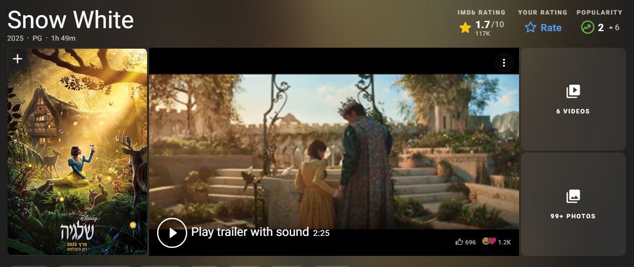 הקהל מצביע גם בדירוגים: באתר IMDB, פלטפורמה מקיפה לדירוגים, ביקורות ומידע על סרטים וסדרות, מדורג הסרט שלגיה ב-1.7 כוכבים, מתוך עשרה. מדובר בנתון שממשיך לרדת, ואולי עוד יישבור שיא של דיסני.