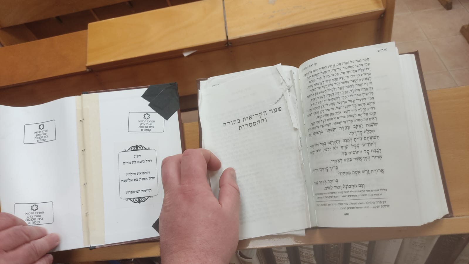 אורח שהגיע אתמול לבתי החולים וביקש להתפלל, לקח מארון הסידורים, את סידור 'רינת ישראל' המזוהה עם המגזר הסרוג, ולהפתעתו גילה כי העמודים נתלשו בצורה גסה.
