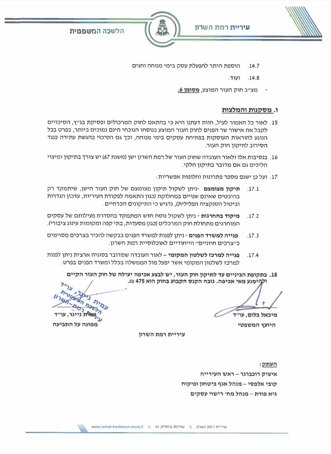 "חוות דעתנו היא כי בהתאם לחוק המרכולים ופסיקת בג"צ, הסיכויים לקבל את אישור שר הפנים לחוק העזר המוצע בנוסחו הנוכחי הינם נמוכים ביותר, בפר בכל הנוגע להוראות העוסקות בפתיחת עסקים ביום המנוחה, וכך גם הסיכוי בהגשת עתירה כנגד הסירוב לתיקון חוק העזר".