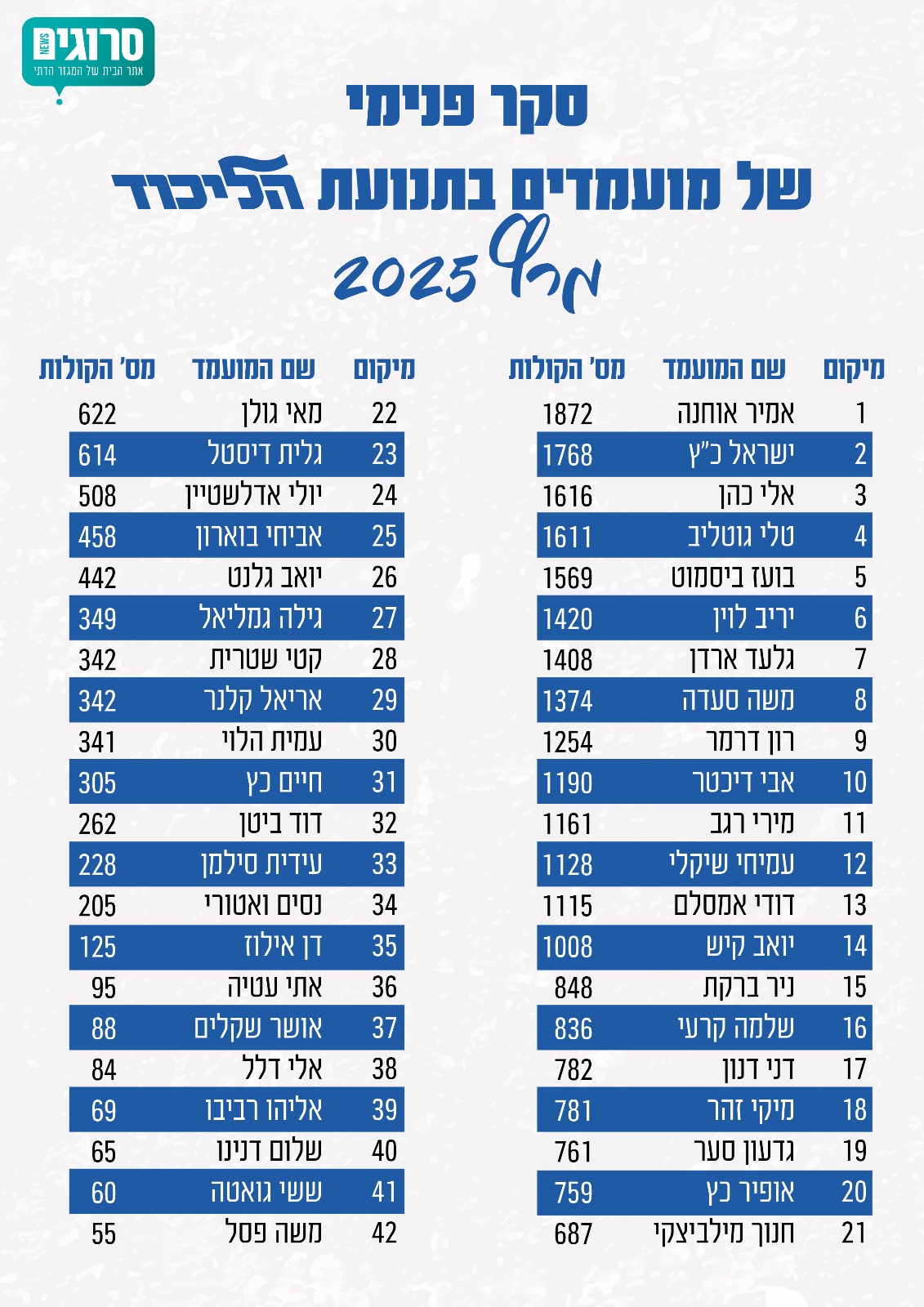 סקר פנימי שנערך בליכוד ותוצאותיו הגיעו לידי סרוגים מעלה כי השלישייה המובילה בליכוד היא: אמיר אוחנה, ישראל כ"ץ ואלי כהן, הצמד שסוגר את החמישייה הראשונה, יש שיגידו באופן מפתיע הם טלי גוטליב ובועז ביסמוט.
