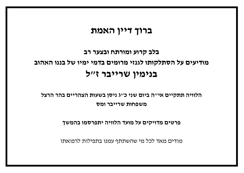 ברוך דיין האמת. מספר ימים אחרי שפונה לבית החולים בעקבות דום לב שעבר אחרי ריצה, הבוקר נפטר בנימין שרייבר. הלוויה תתקיים היום, יום שני כ"ג ניסן, בשעה 15:00 בהר הרצל.