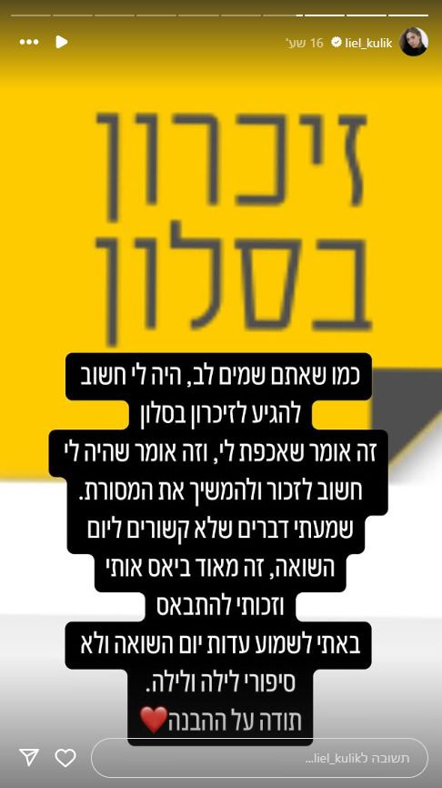 ליפמן סיימה בקריאה לפעולה: "קחו ביד את בני ה-12 פלוס שלכם ותלכו ל'זיכרון בסלון'… כי 'לעולם לא עוד' זו לא סיסמה, זו מציאות".
