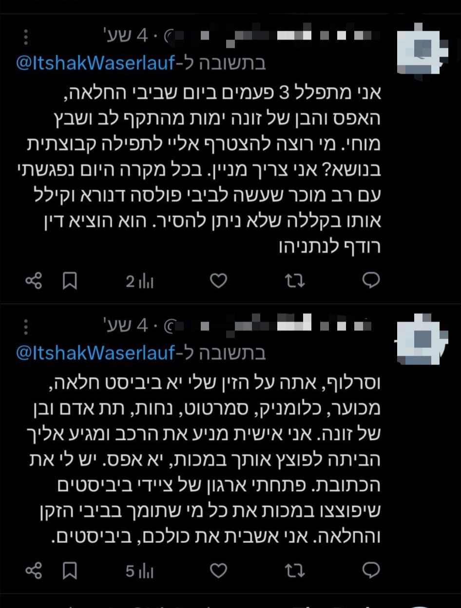 החשוד כתב לשר וסרלאוף בטוויטר: "אני אישית יניע את הרכב, יגיע אלייך הביתה ואפוצץ אותך במכות, יא אפס יש לי את הכתובת. פתחתי ארגון של ציידי ביביסטים שיפוצצו במכות את כל מי שתומך בביבי. אני אשבית כולכם ביביסטים".