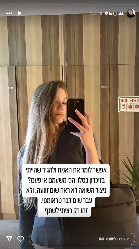 בעקבות הסערה המתמשכת, קוליק פרסמה סרטון שבו פנתה ישירות לקהל: "היי לכולם, קוראים לי ליאל. ראיתם בטח את כל הפרסומים ברשת. חשוב לי להסביר את עצמי. כל כך חשוב לי הנושא של יום השואה, לכן הלכתי לזיכרון בסלון. היה לי חשוב למסור את הסיפור הלאה ולהמשיך את המסורת".