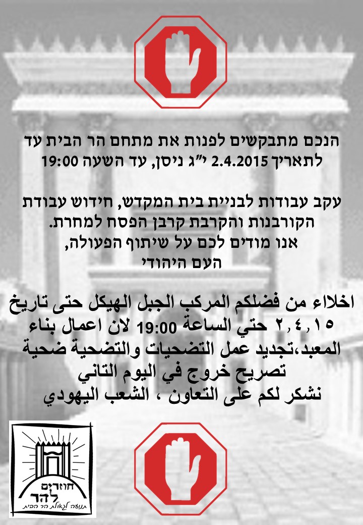 הלילה (ה') תלו פעילי תנועת "חוזרים להר" שלטים ברחבי הרובע המוסלמי ומחוץ לשערי הר הבית הקוראים למוסלמים לפנות את המתחם עד לשעה 19:00 הערב וזאת כדי לאפשר את בניית המזבח והקרבת קרבן פסח מחר בצהריים.