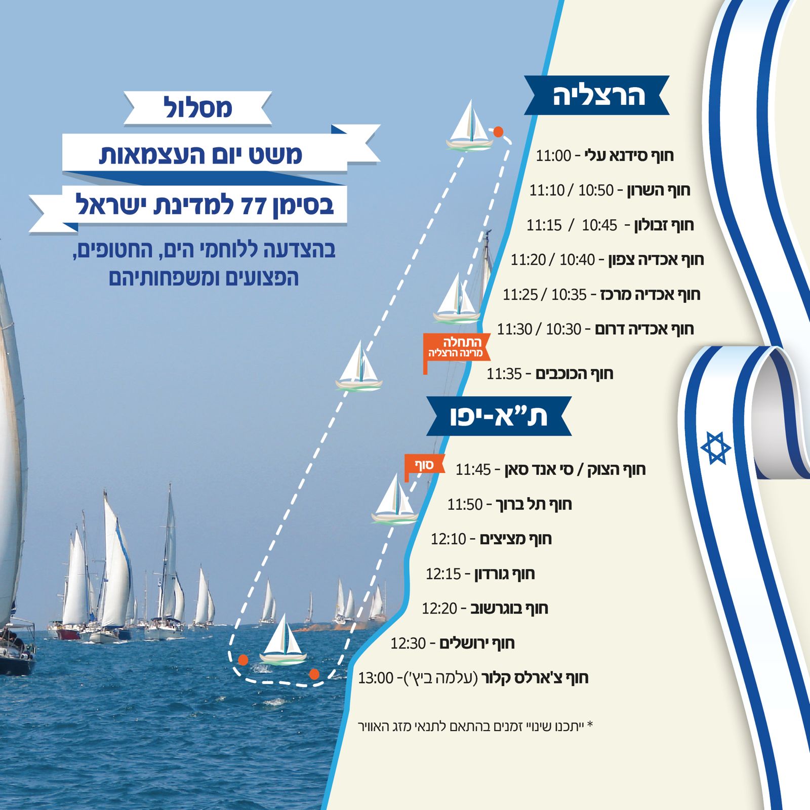 ביום חמישי הקרוב יתקיים משט יום העצמאות ה-77 של מדינת ישראל, אירוע ימי מסורתי שיוצא לדרך מהמרינה בהרצליה בשעה 10:30. השנה, המשט יעמוד בסימן הצדעה ללוחמי חיל הים, תמיכה במשפחות החטופים, הפצועים והשכולות, ויוזמה מיוחדת לשילוב משפחות לוחמים שנפצעו במלחמה. האירוע, שצפוי למשוך אלפי צופים לאורך חופי הרצליה ותל אביב, משלב חגיגה לאומית עם מסר של סולידריות וערבות הדדית.