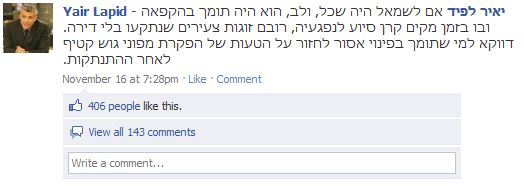 כדרכו, יאיר לפיד, מנסה להצטייר כהוגה הדעות של מדינת ישראל והודעותיו כתובות כדי ליצוק סביבן קונצנזוס. רובן משקפות את האני מאמין שלו.