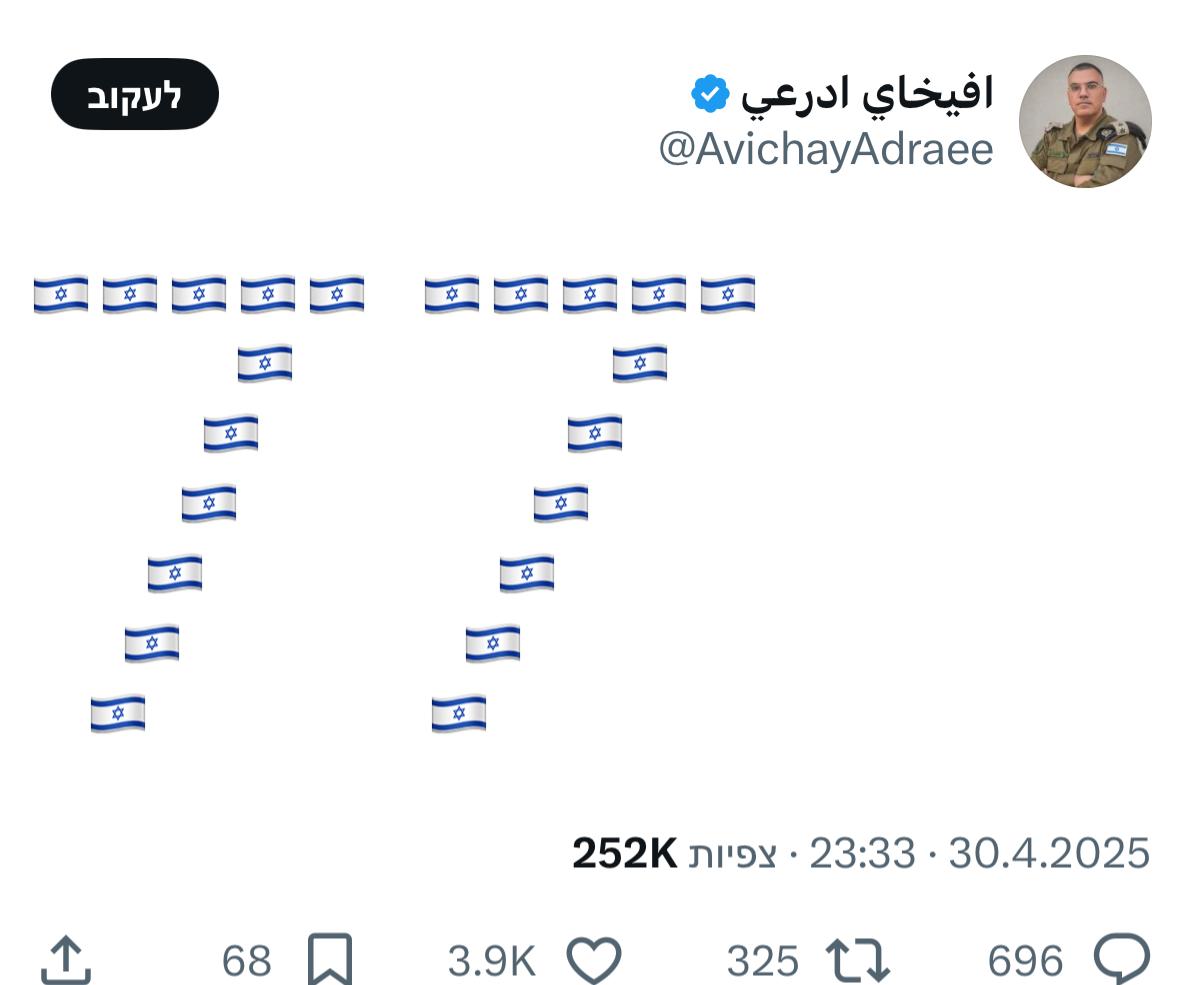 דובר צה"ל בערבית, אלוף-משנה אביחי אדרעי, העלה אמש (רביעי) תמונה בחשבון הטוויטר שלו, בה הוא התייחס ליום העצמאות. הוא פרסם את המספר 77, שנוצר מדגלי ישראל רבים.