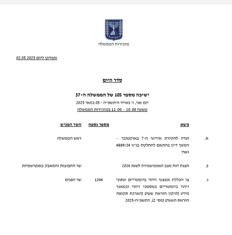 חברי הממשלה עודכנו כי בסדר היום של ישיבת הממשלה שתתקיים ביום שני הבא, ישנו דיון על הקמת ועדת חקירה ממלכתית לאירוע השבעה באוקטובר.