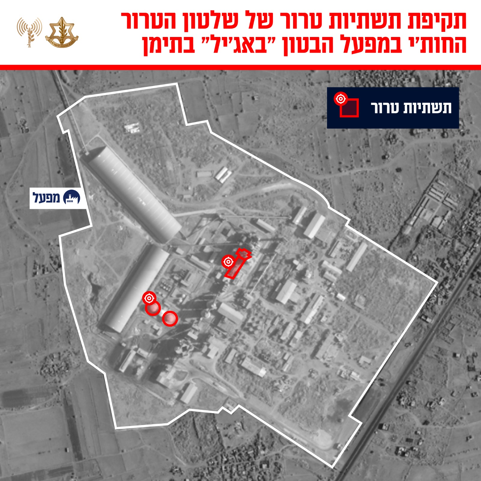 בנוסף, הותקף מפעל בטון ״באג'יל״ מזרחית לעיר חודידה המשמש כמשאב כלכלי חשוב של שלטון הטרור החות'י ומשמש לבניית המנהרות והתשתיות הצבאיות.