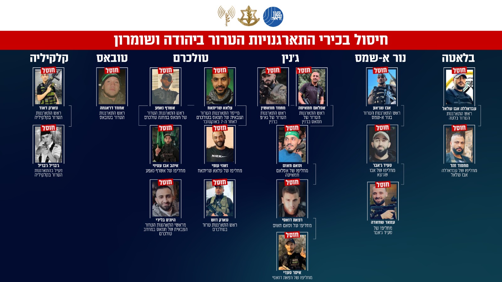 בנוסף מציינים בצה״ל כי מאז תחילת המלחמה, כוחות הביטחון חיסלו בצפון השומרון למעלה מ-700 מחבלים, ביניהם 36 מחבלים בכירים בהתארגנויות הטרור.